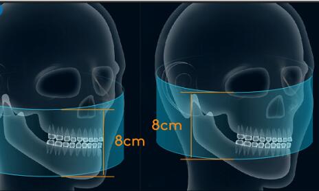 选择的高度以8、14为基准线!一个是高于8,8在鼻尖处可以覆盖到整个牙齿全部情况(如图二左),也是口腔CT最常见的一种视野标准,但由于高度的限制,为了能完整的显示颞下颌关节和上颌窦,有时候不免牺牲掉患者的下颌角影像(如图二右)。14在眼睛顶部位置,高于14的可以做整个颌面外科和整个面部扫描属于未来面扫发展趋势的一种。