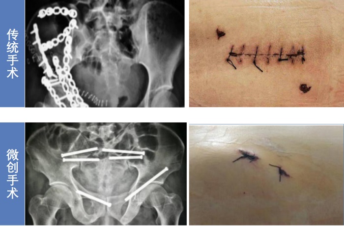如上图对比,相比于传统手术,使用骨科手术机器人(PL300B)的手术伤口由前后各30厘米的切口变成2厘米左右的小切口,手术时间缩短50%以上,出血量减少95%以上,手术并发症发生率大大减少。