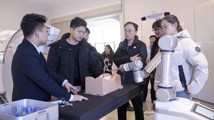 在创新成果展示区,研学团观摩了手术机器人、移动式三维C形臂等设备,详细了解设备的研发理念、技术优势及临床应用场景。